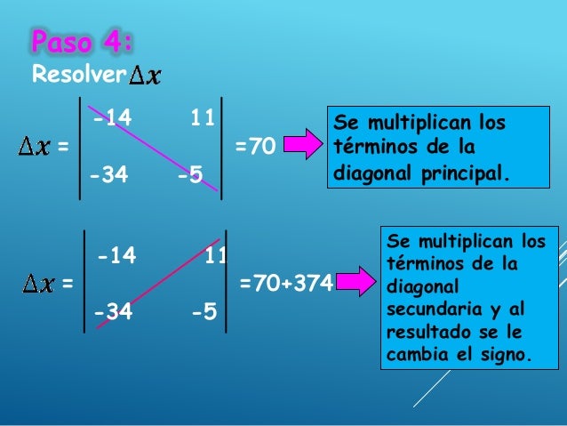 - 9. Paso 4: Resolver -14 11 = =70 -34 -5 Se multiplican los términos de la diagonal principal. -14 11 = =70+374 -34 -5 Se multiplican los términos de la diagonal secundaria y al resultado se le cambia el signo.