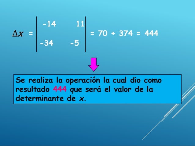 - 10. -14 11 = = 70 + 374 = 444 -34 -5 Se realiza la operación la cual dio como resultado 444 que será el valor de la determinante de x.
