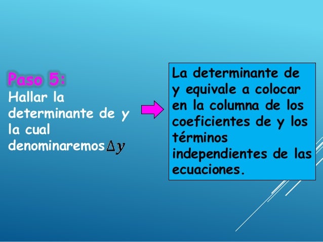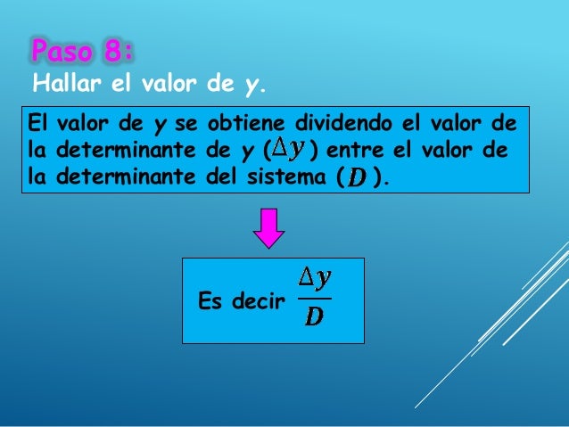 - 17. Paso 8: Hallar el valor de y. El valor de y se obtiene dividendo el valor de la determinante de y ( ) entre el valor de la determinante del sistema ( ). Es decir