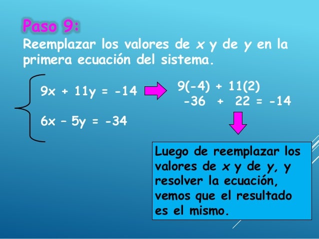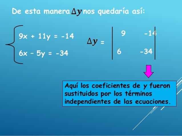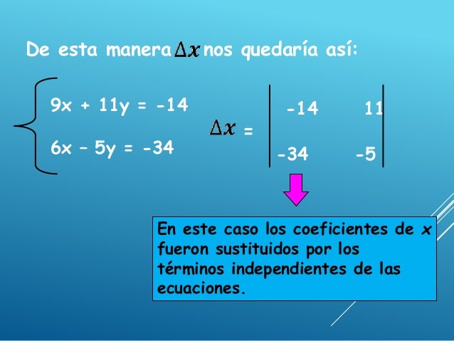 - 12. De esta manera nos quedaría así: 9x + 11y = -14 6x – 5y = -34 9 -14 = 6 -34 Aquí los coeficientes de y fueron sustituidos por los términos independientes de las ecuaciones.