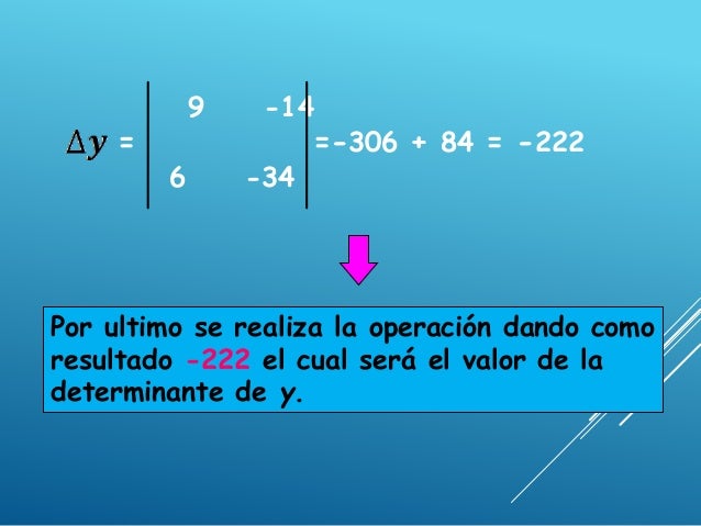 - 14. 9 -14 = =-306 + 84 = -222 6 -34 Por ultimo se realiza la operación dando como resultado -222 el cual será el valor de la determinante de y.