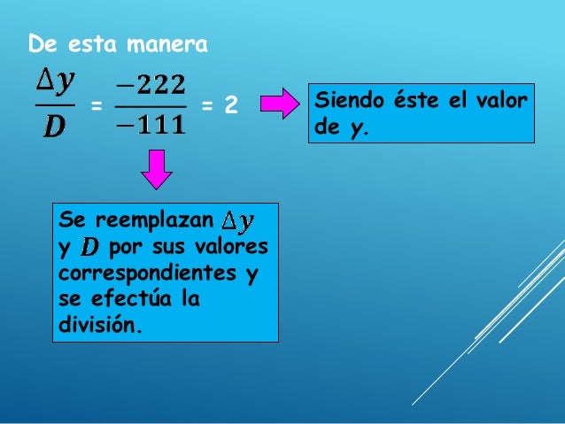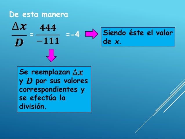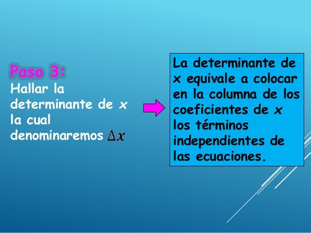 - 15. Paso 7: Hallar el valor de x. El valor de x se obtiene dividendo el valor de la determinante de x ( ) entre el valor de la determinante del sistema ( ). Es decir