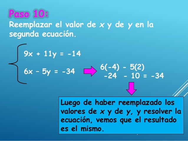 - 20. Paso 10: Reemplazar el valor de x y de y en la segunda ecuación. 9x + 11y = -14 6x – 5y = -34 6(-4) - 5(2) -24 - 10 = -34 Luego de haber reemplazado los valores de x y de y, y resolver la ecuación, vemos que el resultado es el mismo.