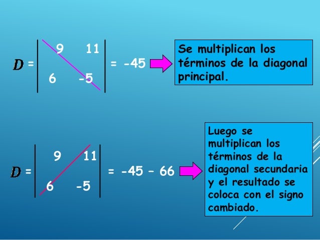 - 5. 9 11 = = -45 6 -5 Se multiplican los términos de la diagonal principal. 9 11 = = -45 – 66 6 -5 Luego se multiplican los términos de la diagonal secundaria y el resultado se coloca con el signo cambiado.