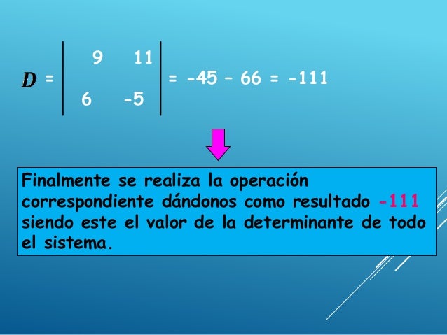- 6. 9 11 = = -45 – 66 = -111 6 -5 Finalmente se realiza la operación correspondiente dándonos como resultado -111 siendo este el valor de la determinante de todo el sistema.
